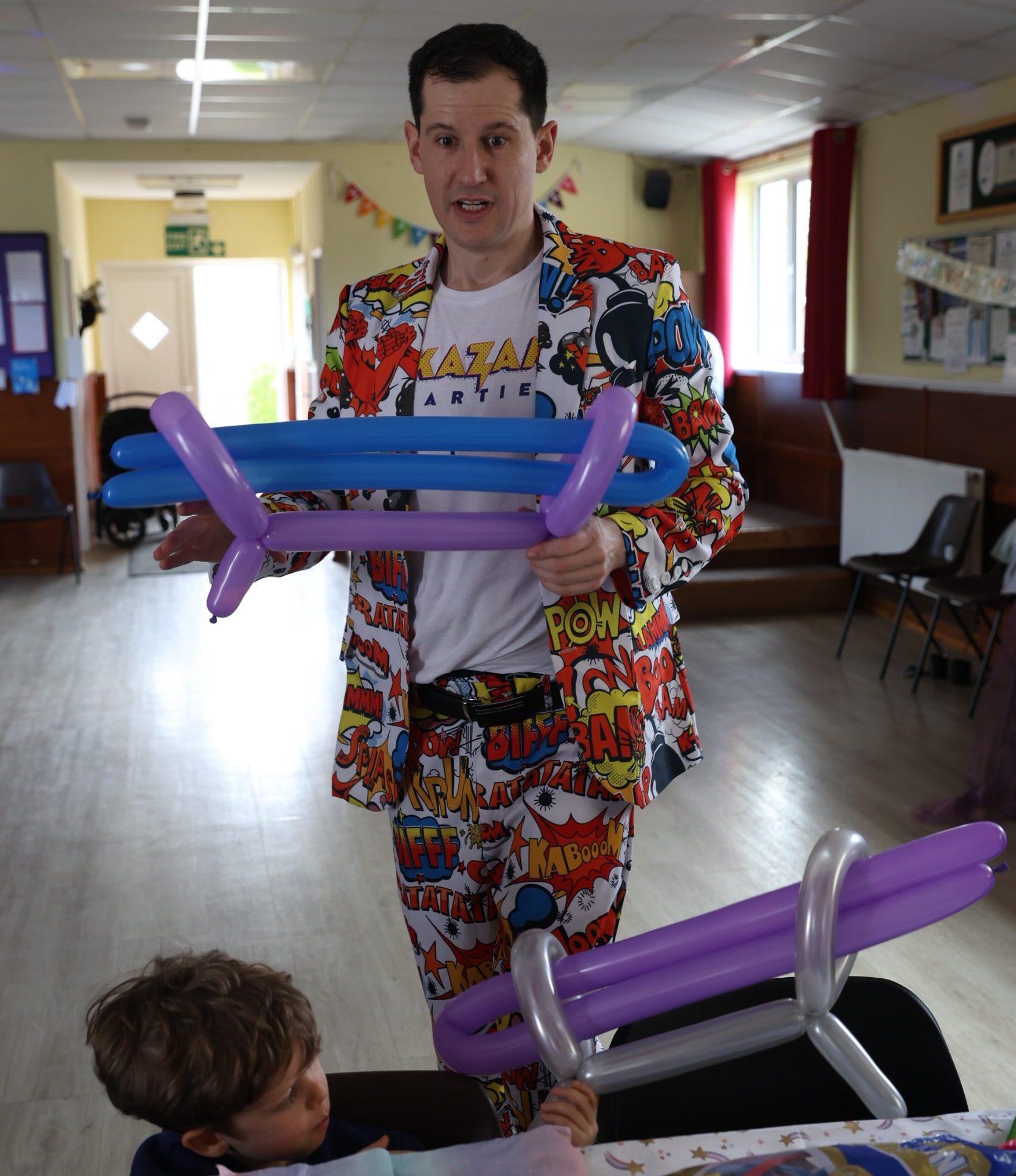 The entertainer gets to know the children whilst waiting for everyone to arrive. They blow bubbles, let off balloons and have general fun and silliness with the children until we are ready to start the party.